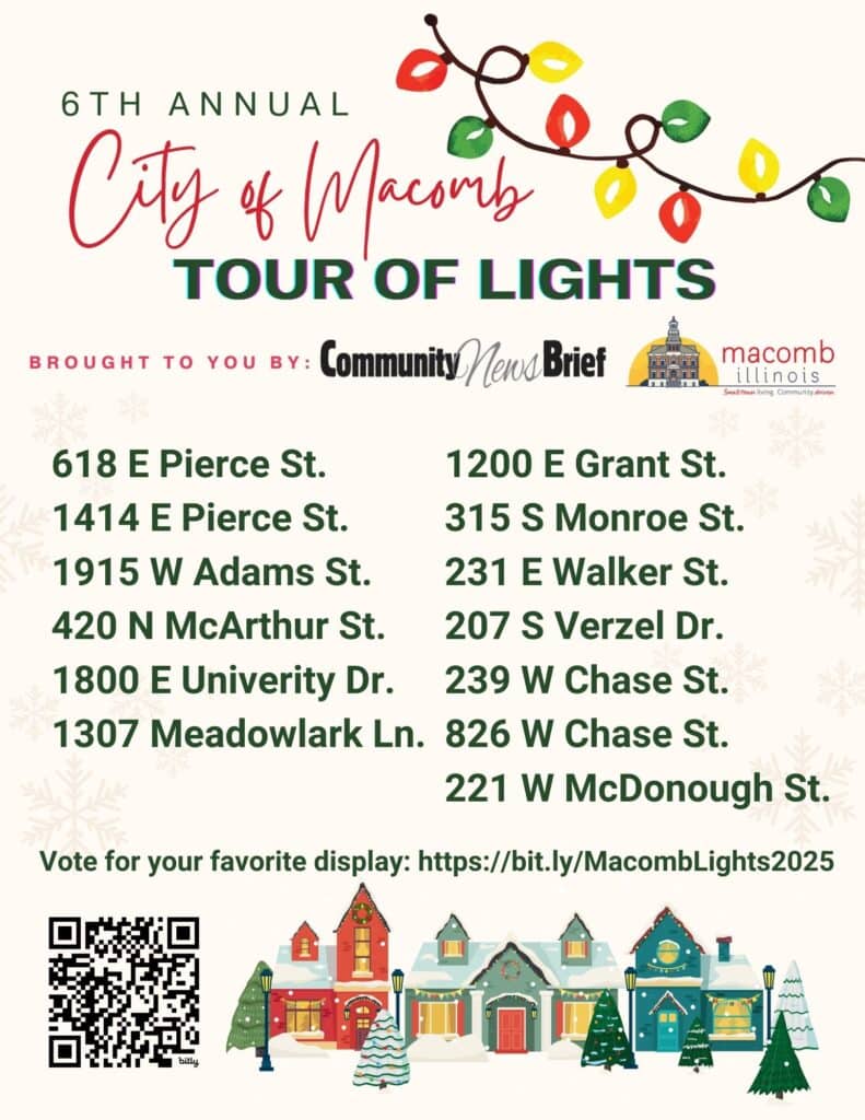 MACOMB, IL- The City of Macomb Tour of Lights is ready for holiday viewing by visitors and community members. This year, those who tour the lights can vote for their favorite display by using the following JotForm link: https://bit.ly/MacombLights2025. Only one submission will be accepted per voter.